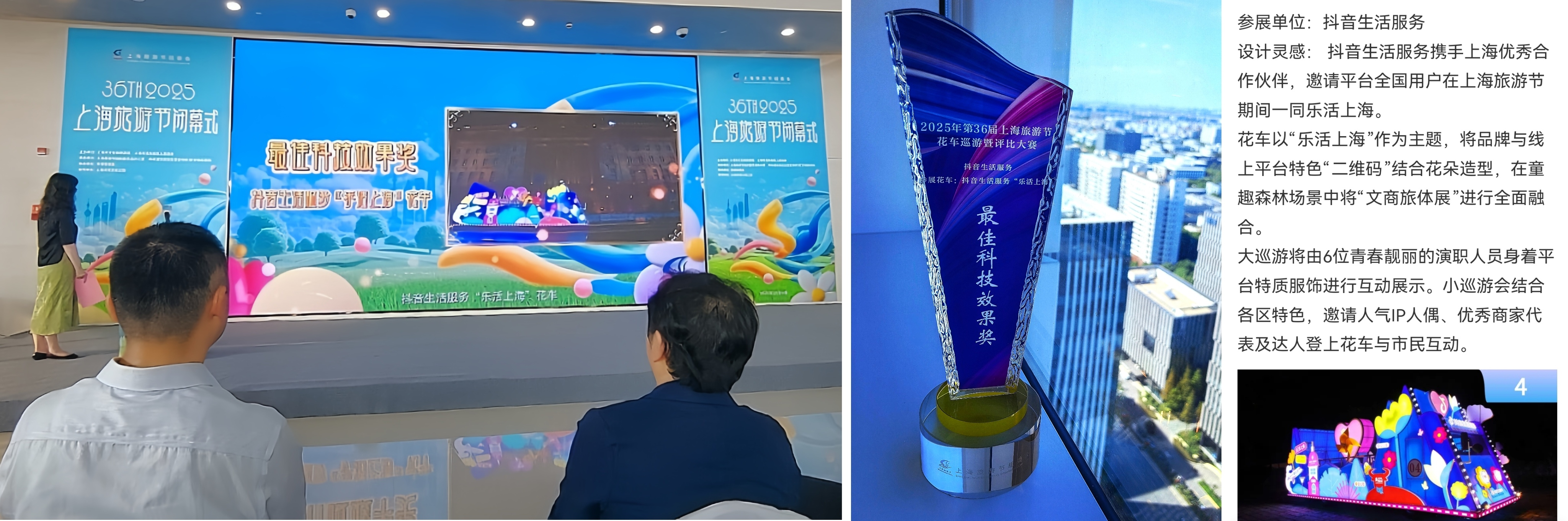 10月6日,2025年第36届上海旅游节闭幕式新闻发布会在世博文化公园温室花园举行,抖音生活服务“乐活上海”花车荣获最佳科技效果奖。