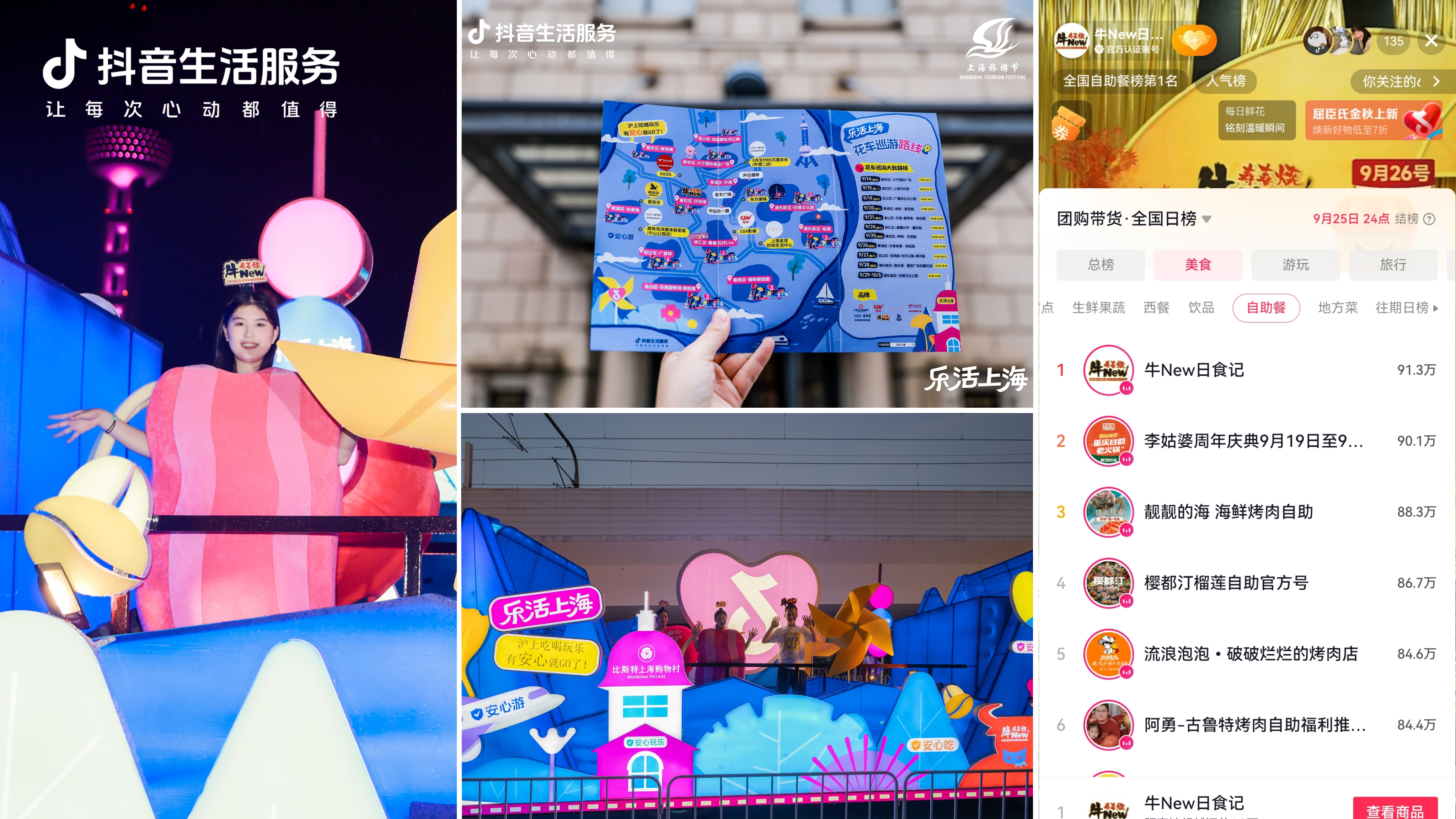 在抖音端,#乐活上海 线上话题总体曝光超3.6亿,“上海旅游节25辆花车惊艳亮相”热点登上同城榜Top1,“上海旅游节显眼包”登上同城榜Top6并持续在榜一周,热点累计曝光突破1457万次,市民自发在多平台传播“乐活上海”花车。围绕花车巡游串联上海市重点商圈及核心场地,抖音生活服务特别邀请人气IP ZANMANG LOOPY、百万粉短视频达人“上海小阿姨”及平台优质商家牛New寿喜烧商家代表登上花车,参与花车巡游与市民互动。