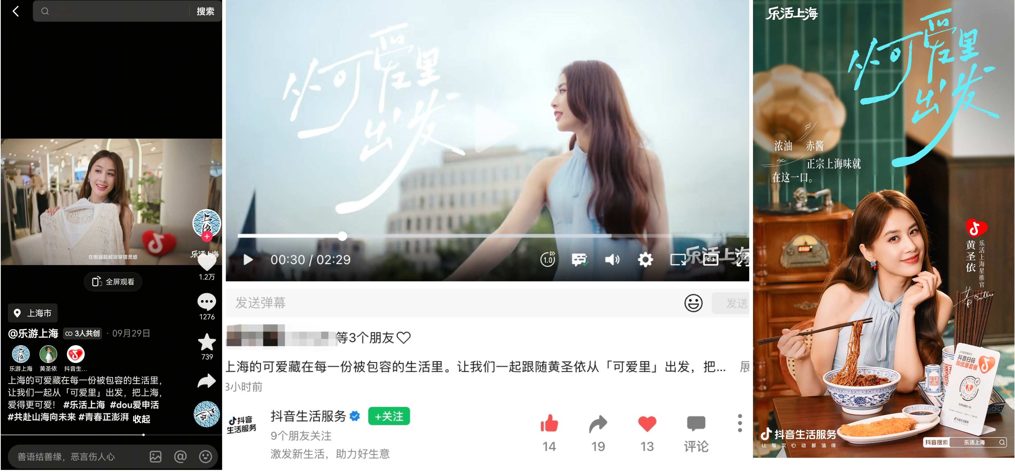 海派明星,更懂上海。抖音生活服务特别邀请沪籍明星黄圣依拍摄“乐活上海”城市宣传片,携手“乐游上海”与上海旅游节同频共振联合宣发,为国庆、中秋双节庆交易爆发提前预热。“从上海的可爱里路出发,展现摩登魔都和烟火人间双面形象。”短片结合生活服务全场景,联动本地老字号餐饮商家——福和面馆、馋三尺及三玛璐酒楼,百联集团第一百货的逛街购物场景,以及太平洋新天地观光厅观光旅游场景,带领平台用户跟随黄圣依体验上海的多层可爱生活。