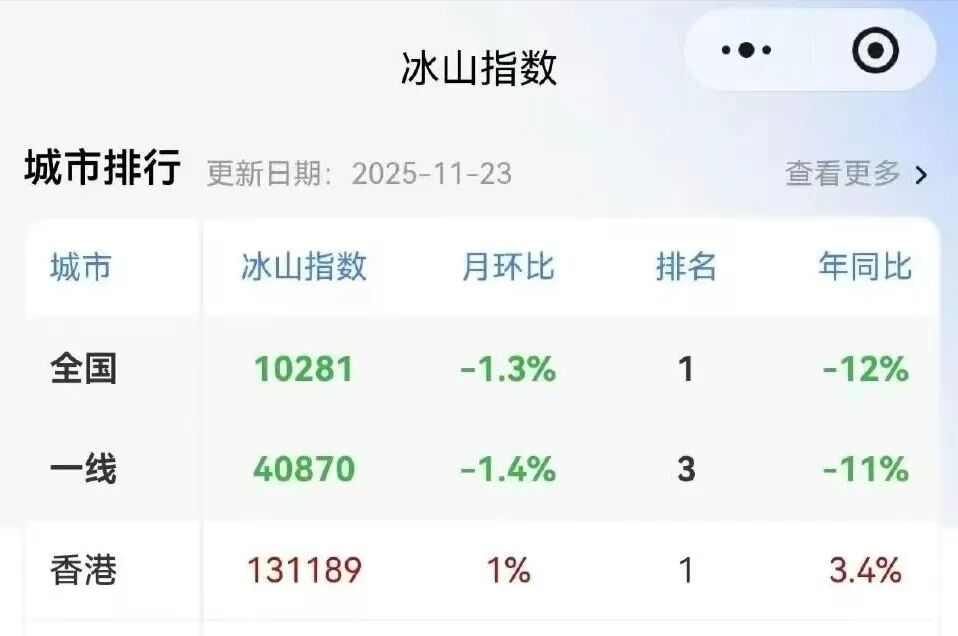 内地机构统计的冰山指数也显示,截至今年11月23日,全国各大城市的冰山指数,只有一个城市环比上涨,那就是香港。作为唯一上行的楼市,香港冰山指数年同比涨幅已达到约3.4%。